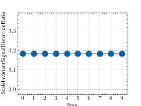 >>> # Example plotting a single value >>> import torch >>> from torchmetrics.audio import ScaleInvariantSignalDistortionRatio >>> target = torch.randn(5) >>> preds = torch.randn(5) >>> metric = ScaleInvariantSignalDistortionRatio() >>> metric.update(preds, target) >>> fig_, ax_ = metric.plot()