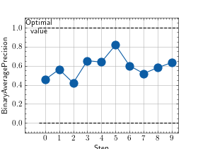 >>> # Example plotting multiple values >>> import torch >>> from torchmetrics.classification import BinaryAveragePrecision >>> metric = BinaryAveragePrecision() >>> values = [ ] >>> for _ in range(10): ... values.append(metric(torch.rand(20,), torch.randint(2, (20,)))) >>> fig_, ax_ = metric.plot(values)