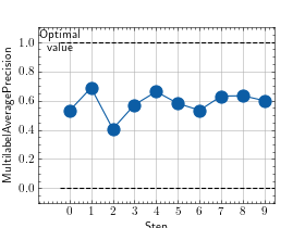 >>> # Example plotting multiple values >>> import torch >>> from torchmetrics.classification import MultilabelAveragePrecision >>> metric = MultilabelAveragePrecision(num_labels=3) >>> values = [ ] >>> for _ in range(10): ... values.append(metric(torch.rand(20,3), torch.randint(2, (20,3)))) >>> fig_, ax_ = metric.plot(values)