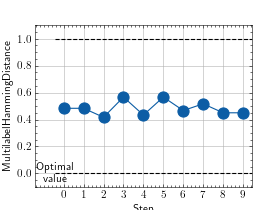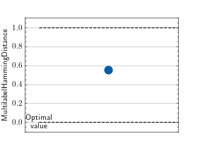 \[\text{Hamming distance} = \frac{1}{N \cdot L} \sum_i^N \sum_l^L 1(y_{il} \neq \hat{y}_{il})\]Where \(y\) is a tensor of target values, \(\hat{y}\) is a tensor of predictions, and \(\bullet_{il}\) refers to the \(l\)-th label of the \(i\)-th sample of that tensor.