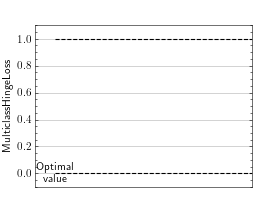 \[\text{Hinge loss} = \max\left(0, 1 - \hat{y}_y + \max_{i \ne y} (\hat{y}_i)\right)\]Where \(y \in {0, ..., \mathrm{C}}\) is the target class (where \(\mathrm{C}\) is the number of classes), and \(\hat{y} \in \mathbb{R}^\mathrm{C}\) is the predicted output per class. Alternatively, the metric can also be computed in one-vs-all approach, where each class is valued against all other classes in a binary fashion.