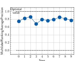 >>> from torch import rand, randint >>> # Example plotting multiple values >>> from torchmetrics.classification import MultilabelRankingAveragePrecision >>> metric = MultilabelRankingAveragePrecision(num_labels=3) >>> values = [ ] >>> for _ in range(10): ... values.append(metric(rand(20, 3), randint(2, (20, 3)))) >>> fig_, ax_ = metric.plot(values)