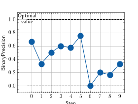 >>> from torch import rand, randint >>> # Example plotting multiple values >>> from torchmetrics.classification import BinaryPrecision >>> metric = BinaryPrecision() >>> values = [ ] >>> for _ in range(10): ... values.append(metric(rand(10), randint(2,(10,)))) >>> fig_, ax_ = metric.plot(values)