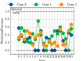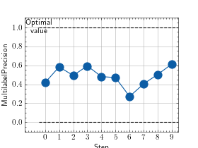>>> from torch import rand, randint >>> # Example plotting multiple values >>> from torchmetrics.classification import MultilabelPrecision >>> metric = MultilabelPrecision(num_labels=3) >>> values = [ ] >>> for _ in range(10): ... values.append(metric(randint(2, (20, 3)), randint(2, (20, 3)))) >>> fig_, ax_ = metric.plot(values)
