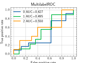 >>> pred = tensor([[0.8191, 0.3680, 0.1138], ... [0.3584, 0.7576, 0.1183], ... [0.2286, 0.3468, 0.1338], ... [0.8603, 0.0745, 0.1837]]) >>> target = tensor([[1, 1, 0], [0, 1, 0], [0, 0, 0], [0, 1, 1]]) >>> roc = ROC(task='multilabel', num_labels=3) >>> fpr, tpr, thresholds = roc(pred, target) >>> fpr [tensor([0.0000, 0.3333, 0.3333, 0.6667, 1.0000]), tensor([0., 0., 0., 1., 1.]), tensor([0.0000, 0.0000, 0.3333, 0.6667, 1.0000])] >>> tpr [tensor([0., 0., 1., 1., 1.]), tensor([0.0000, 0.3333, 0.6667, 0.6667, 1.0000]), tensor([0., 1., 1., 1., 1.])] >>> thresholds [tensor([1.0000, 0.8603, 0.8191, 0.3584, 0.2286]), tensor([1.0000, 0.7576, 0.3680, 0.3468, 0.0745]), tensor([1.0000, 0.1837, 0.1338, 0.1183, 0.1138])]