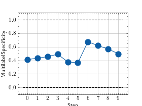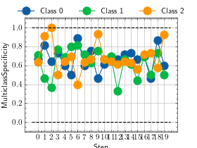 >>> from torch import rand, randint >>> # Example plotting multiple values >>> from torchmetrics.classification import MultilabelSpecificity >>> metric = MultilabelSpecificity(num_labels=3) >>> values = [ ] >>> for _ in range(10): ... values.append(metric(randint(2, (20, 3)), randint(2, (20, 3)))) >>> fig_, ax_ = metric.plot(values)