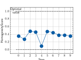 >>> # Example plotting multiple values >>> import torch >>> from torchmetrics.clustering import HomogeneityScore >>> metric = HomogeneityScore() >>> values = [ ] >>> for _ in range(10): ... values.append(metric(torch.randint(0, 4, (10,)), torch.randint(0, 4, (10,)))) >>> fig_, ax_ = metric.plot(values)