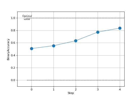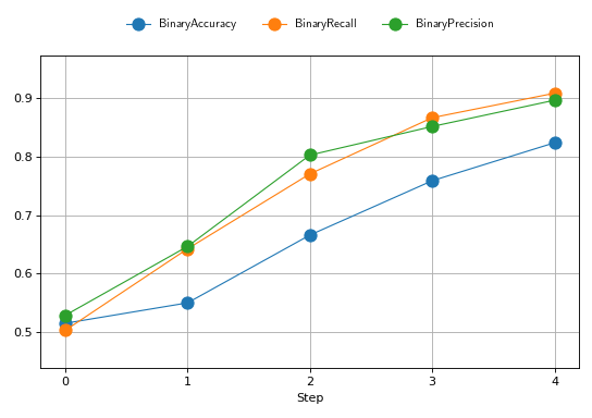 Do note that metrics that do not return simple scalar tensors, such as ConfusionMatrix, ROC that have specialized visualization does not support plotting multiple steps, out of the box and the user needs to manually plot the values for each step.
